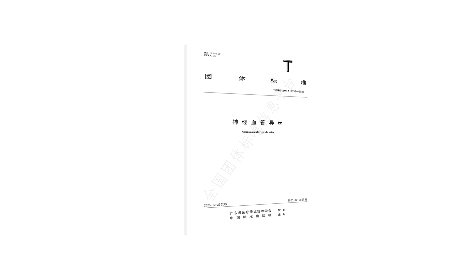 2025年12月26日,广东省医疗器械管理学会(以下简称学会)团体标准《神经血管导丝》(T/GDMDMA 0053—2025)正式发布并实施。